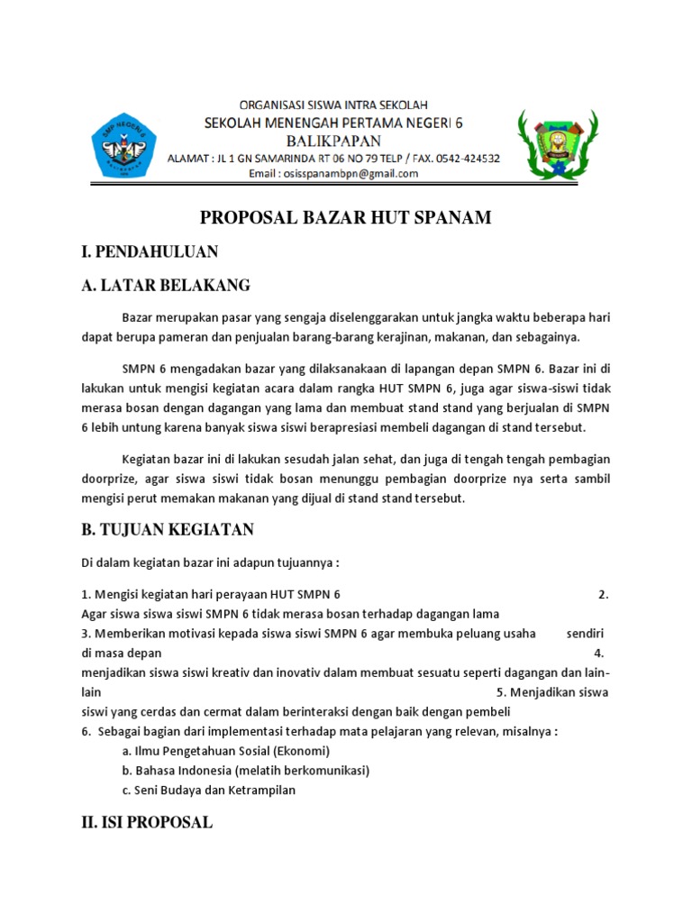 Dalam proposal tersebut memuat (a) nama kegiatan, (b) pendahuluan, (c) tujuan, (d) anggaran (e) jadwal, dan (f) susunan panitia. Ada banyak cara untuk mendapatkan modal untuk memulai atau mengembangkan … Penutup demikian proposal kegiatan ini kami buat agar menjadi dasar pertimbangan dalam menyetujui dan mundukung kegiatan ini, atas perhatian, dukungan dan bantuannya kami ucapkan terima kasih. Seksi bidang pembinaan kualitas jasmani, kesehata, dan gizi berbasis sumber gizi yang teridentifikasi. Bogor, 20 oktober 2019 ketua pelaksana, sekretaris, rochmat s.kom selina nabillah mengetahui, general manager, penanggung jawab, andes maulana, s.kom …